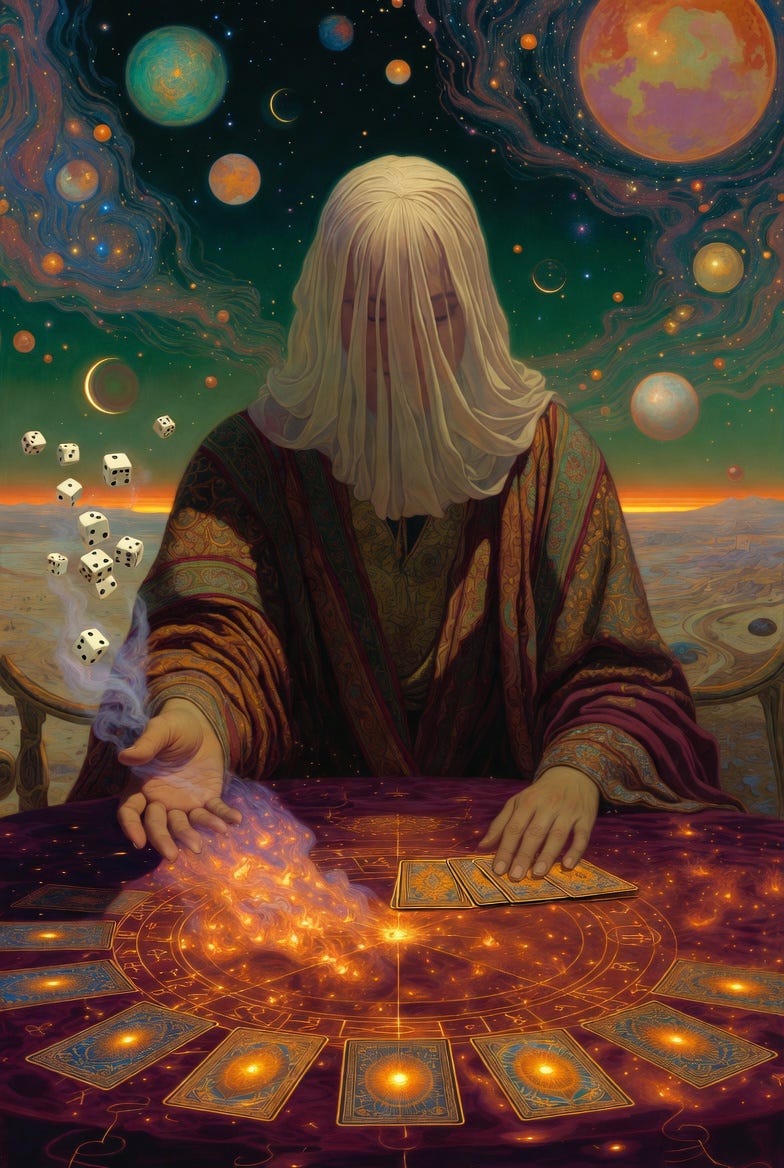 The Sacred doesn’t need to control the dice to still be present in the game. It doesn’t narrate every twist to still hold the whole. Perhaps our lives is not in the content of the cards but in the space that opens up when you receive them and must decide what to do.